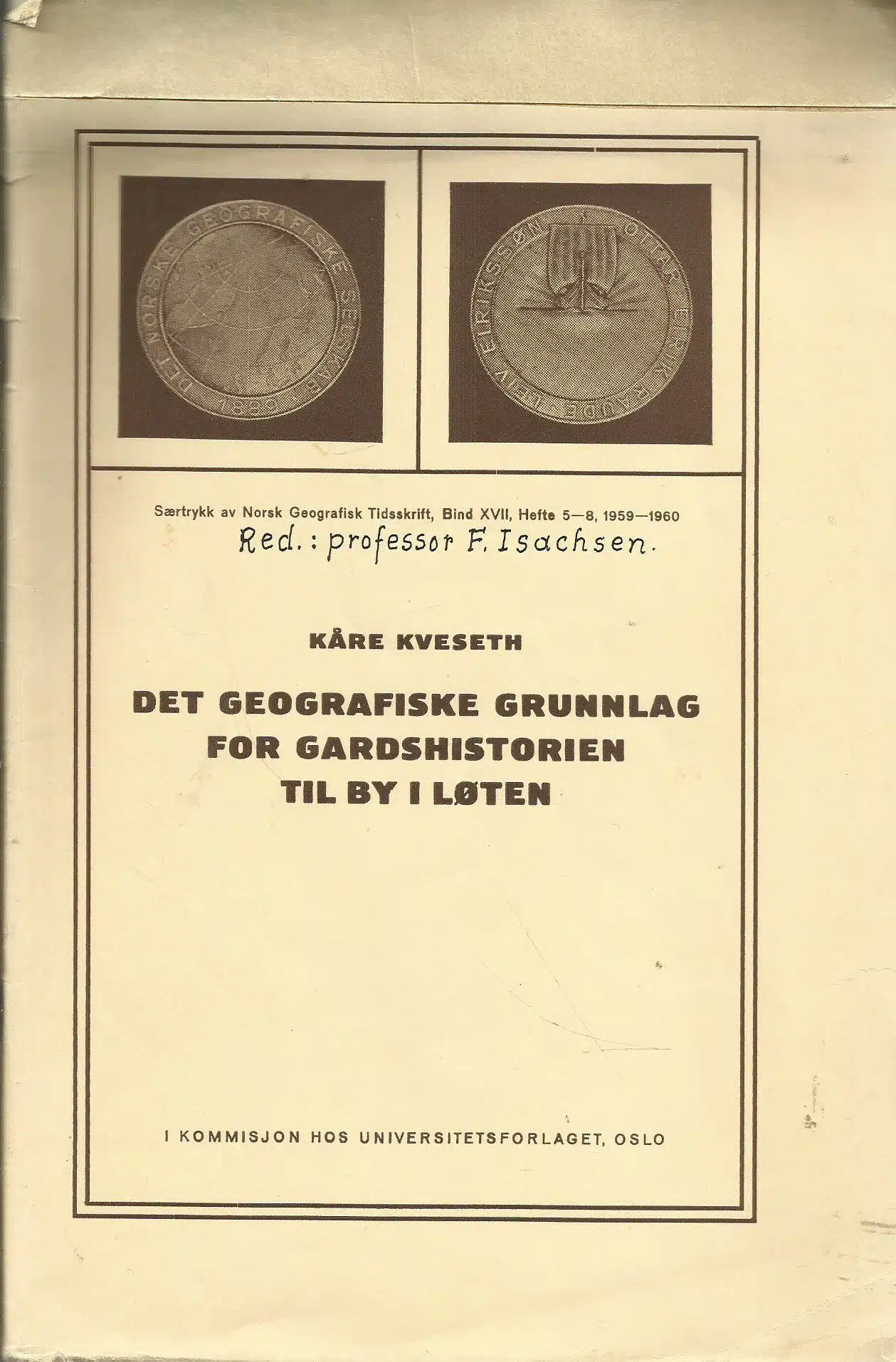 Særtrykk av Norsk Geografisk Tidsskrift, Bind XVII, Hefte 5-8, 1959-1960. s. 290-310. Med 5 tekstfigurer og en løs kartplansje, bakerst i heftet. Tape øverst på foromslag og stor rift på ryggen, ellers ok.