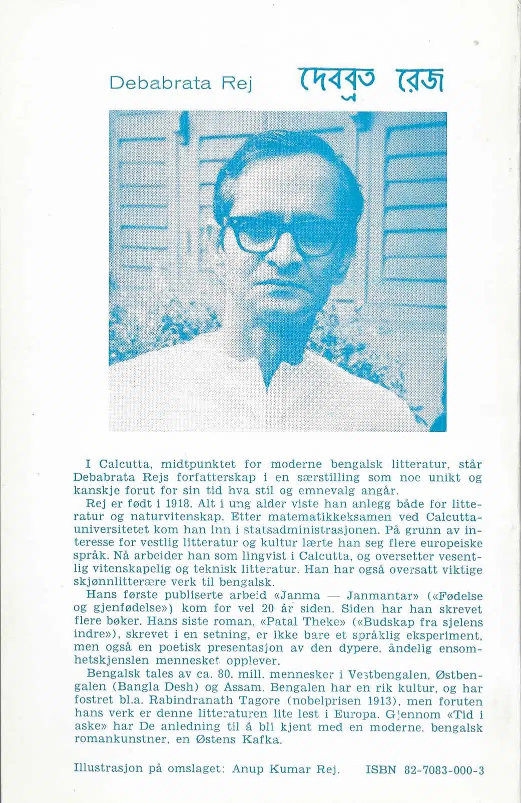 Snøfugl forlag, Melhus 1972. Heftet. 137 s. Debabrata Rej, Calcutta, er en moderne romankunstner som inntar en særstilling innenfor moderne, bengalsk litteratur – en Østens Kafka. Anup Kumar Rej er ansvarlig for omslagets illustrasjon.